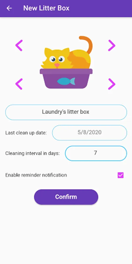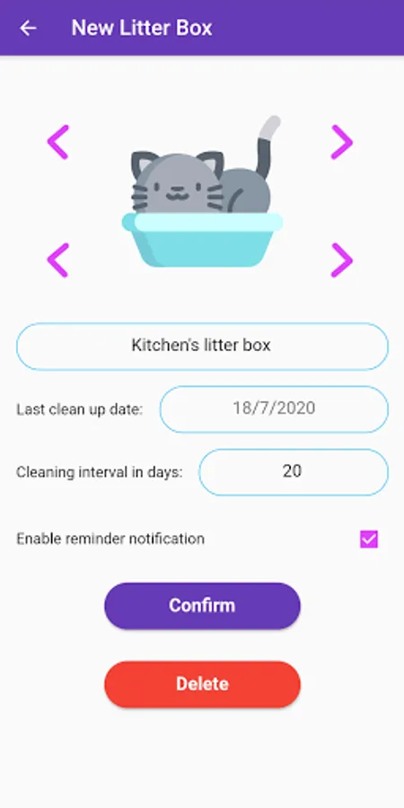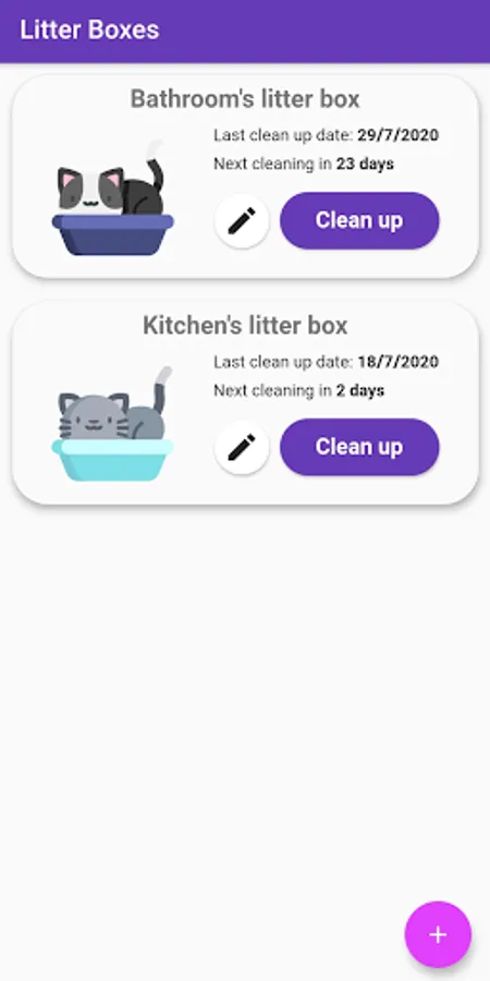 This objetive of this app is very simple, with a simple interface we will schedule days for you clean up the litter boxes. It's possible to register how many litter boxes you have, and set different clean up intervals for them.