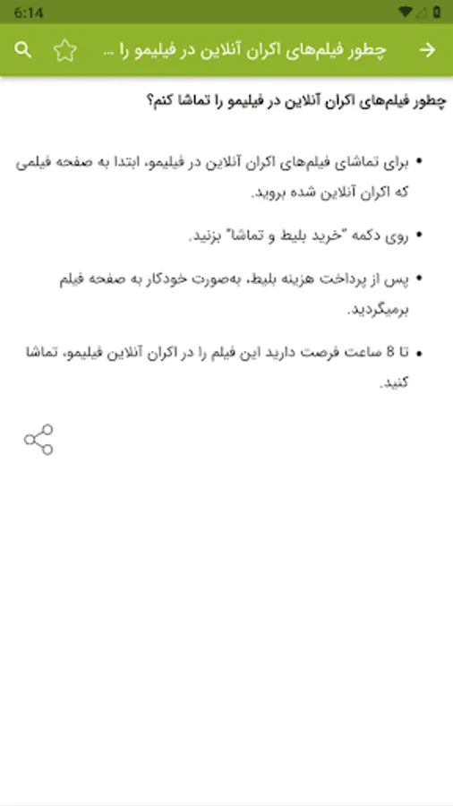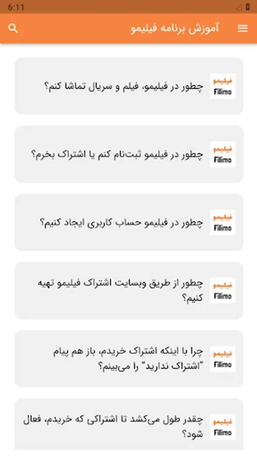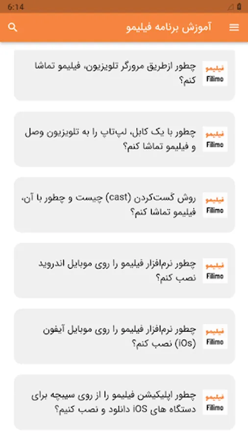 How can I watch movies and series in Filmo? / How do I register or buy a subscription to Filmo? / How to create an account in Filmo? / How to get a movie subscription through the website? / Why do I still see the message "You do not have a subscription" even though I bought a subscription? / How long will it take for the subscription I bought to be activated? / Which banks can I make payments from? / How can I watch free movies and series on Filmo? / How many people can watch movies with one account? / How to add a new member to my account? / How to remove a member from my account? / How to delete old members and add members / How to activate the child lock for a member? / How to edit the information and age category of a member of my user account? / How to block another device's access to my user account? / Simultaneous use of three devices in Filmo / How to watch Filmo on TV? / How to watch movies using Android TV application? / How to watch movies on LG TVs? / What is the mirroring method (screen mirror) and how can I watch a movie with it? / How to watch a movie through the TV browser? / How to connect the laptop to the TV and watch movies with a cable? / What is the casting method and how can I watch a movie with it? / How to install Filmo software on Android mobile phone? / How to install Filmo software on iPhone (iOs)? / How to download and install Filmo application from Sibcheh for iOS devices? / How to download Filmo movies and watch them when we don't have internet? / Why can't I save videos in gallery? / What is the internet usage like by buying Filmo subscription? / What is the usage of internet in free Irancell subscription?