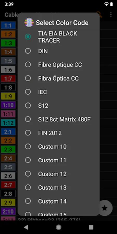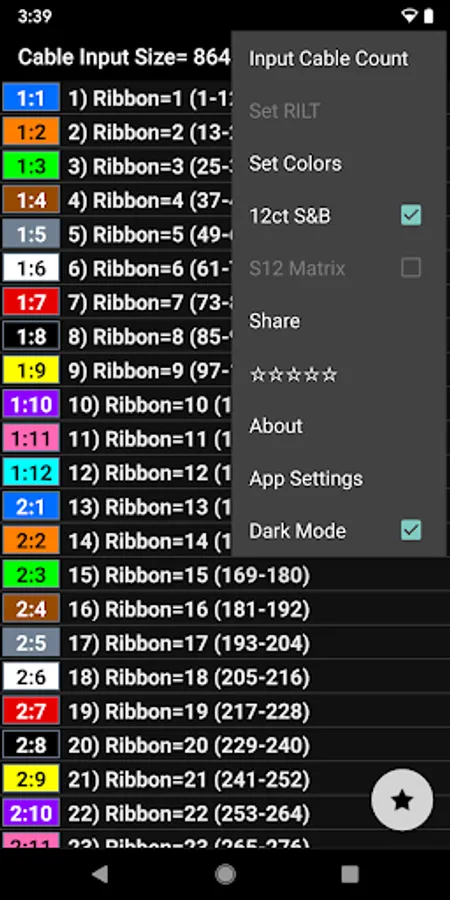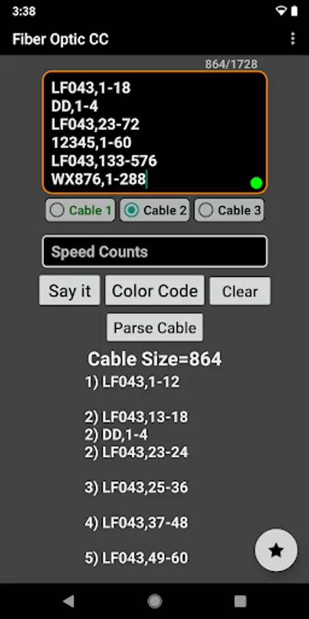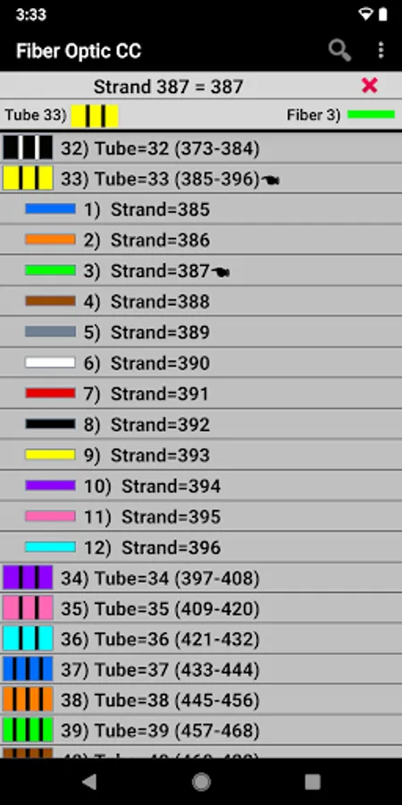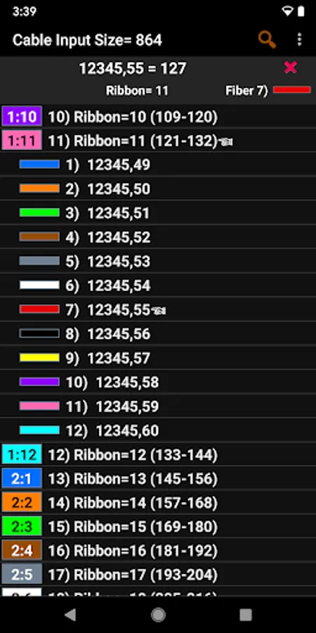 While not necessary to use in the app. You can enter full complex cable count that can be split into the group size of your choice at the Count Input screen. Then you can select the 'Color Code' button to have your custom cable count placed in the easy to use expanding fiber chart. Where you can locate a loose tube or ribbon cables fiber optic color code, sheath count, and your own custom entered complex cable count on fiber optic cables of up to 3456F in size.