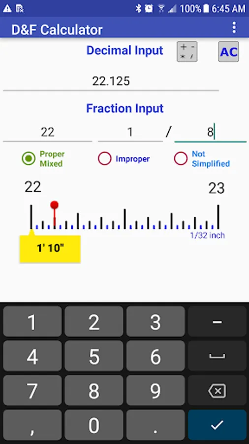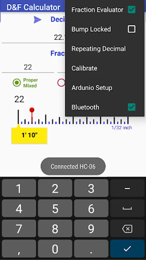 • 'Bump to Nearest' Decimal = 0.1, 0.01, 0.001, 0.0001 or Fraction = 1/4, 1/8, 1/16, 1/32, 1/64 and 1/128 or enter your own Custom Fraction Denominator from 1/2 to 1/99999 by clicking left or right halves of the inch style number line. Go to Menu>Calibrate to set the 'Bump to Nearest' value.