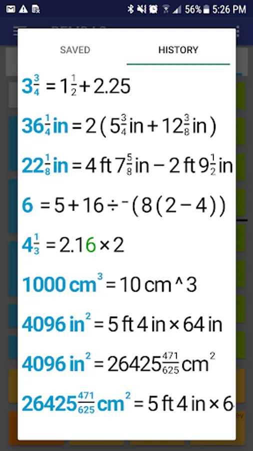 • Display your entered fraction, decimal or answer to the measurement screen by clicking the "=" button.