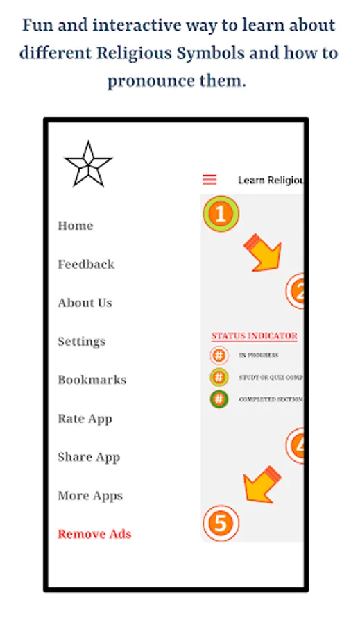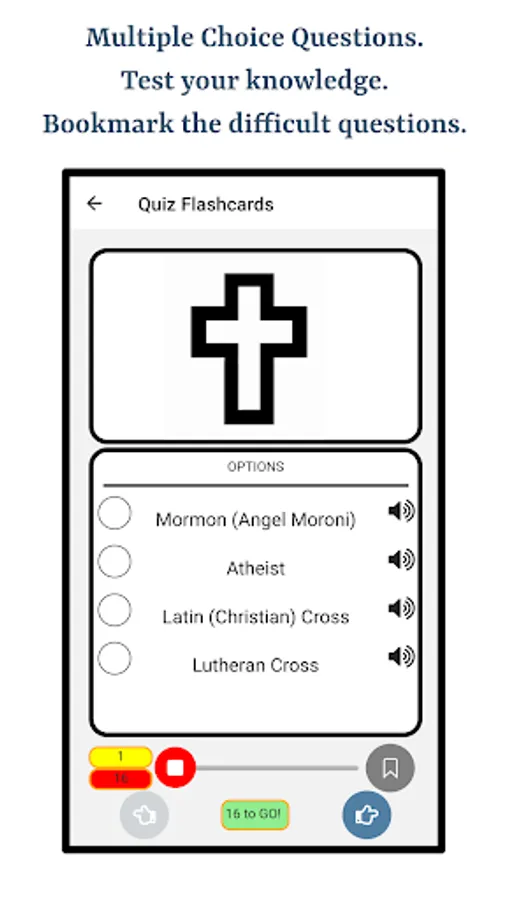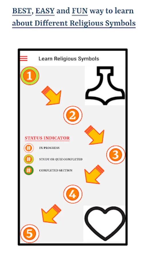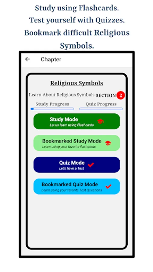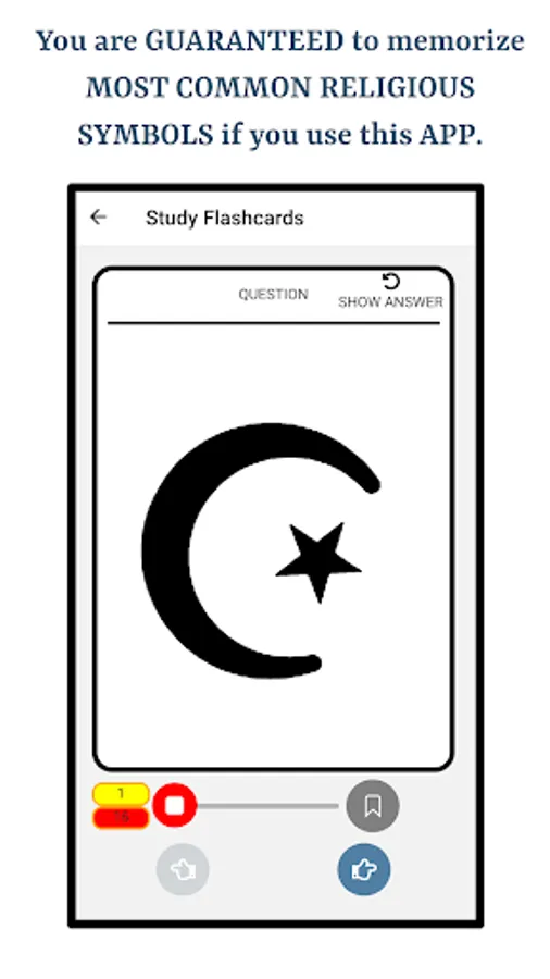 This app is a great resource to memorize Most Commonly Used Religious Symbols . The app is engineered to make users perfect identifying different religious symbols by studying for a very short amount of time. Audio functionality and bookmarking is available throughout the app on chapter, section, study mode and quiz modes.