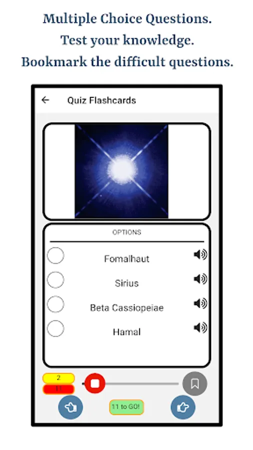 This app is a great resource to memorize Most Prominent Stars. The app is engineered to make users perfect identifying most prominent stars by studying for a very short amount of time. Audio functionality and bookmarking is available throughout the app on chapter, section, study mode and quiz modes.