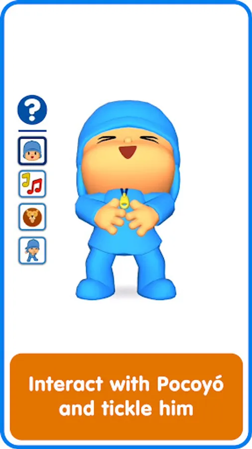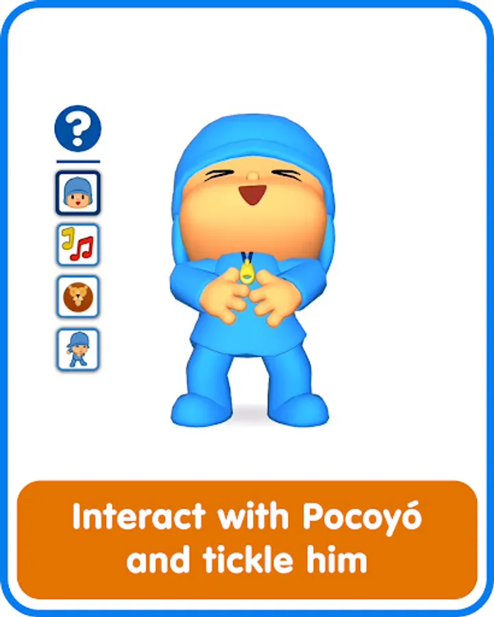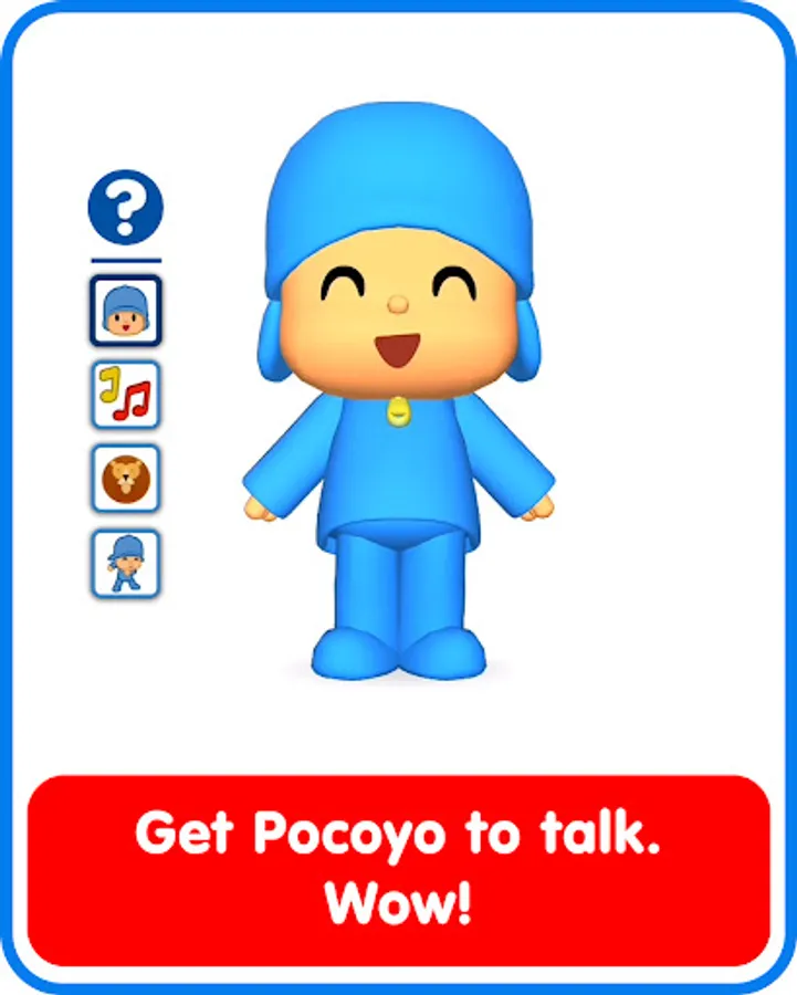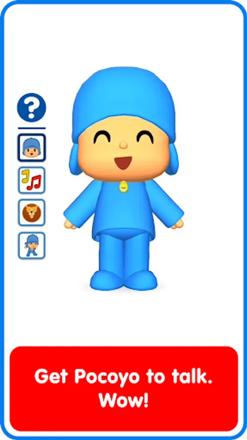 - Play with Pocoyo: Pocoyó reacts when you touch any part of his body. Try to discover all his moves! Also, if you talk to Pocoyó, he will repeat your voice back in a very funny way. Try and see how he sings.