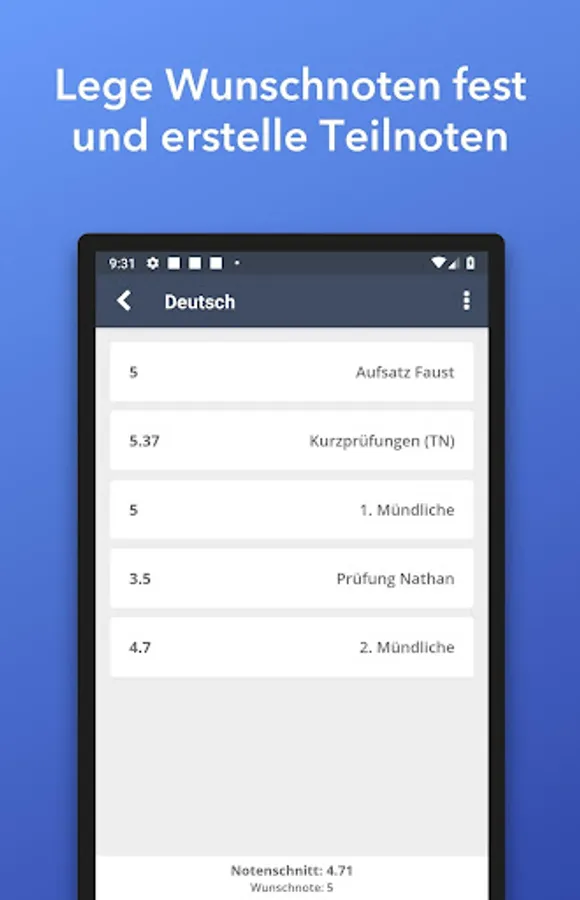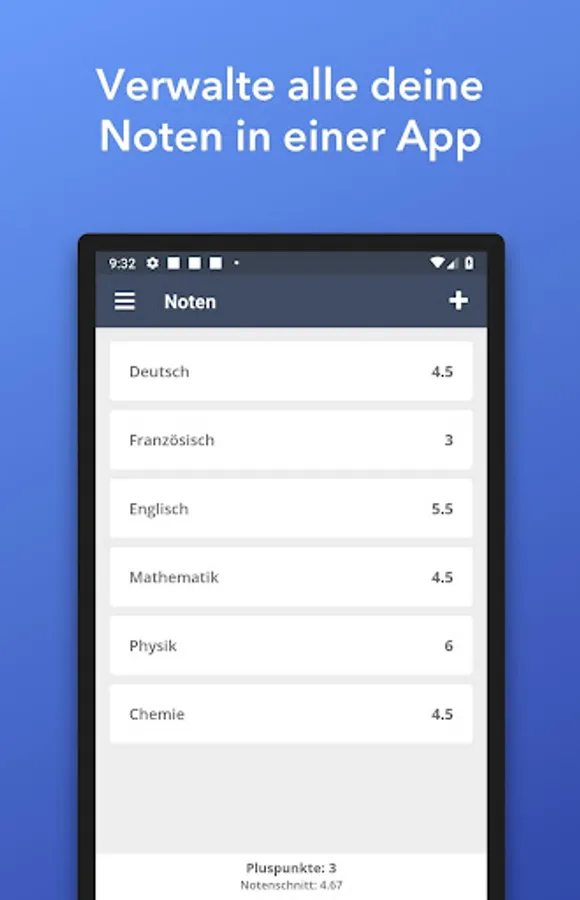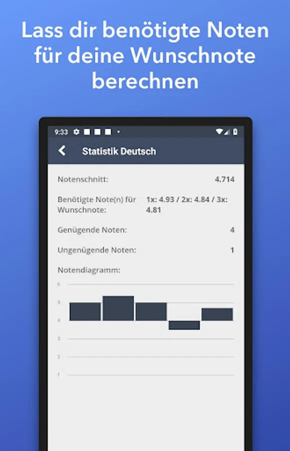 With this modern, simple note calculator you can manage all your school grades in one app. You can specify desired notes for all subjects and you will be calculated which notes you need to write in order to achieve them. In addition, helpful statistics are displayed with diagrams. This includes, among other things, the entire grade average and the number of plus points.