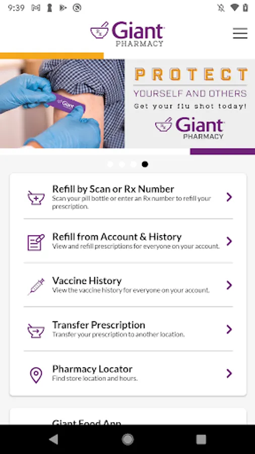 At Giant Pharmacy, we can fill your prescriptions for you, your family, and your pets while you shop. We make it easier to get your medicine, with automatic refills, easy prescription transfers, and a wide range of immunizations. Download the Giant Pharmacy app for additional rewards, health and wellness tips, and more in just a few taps!