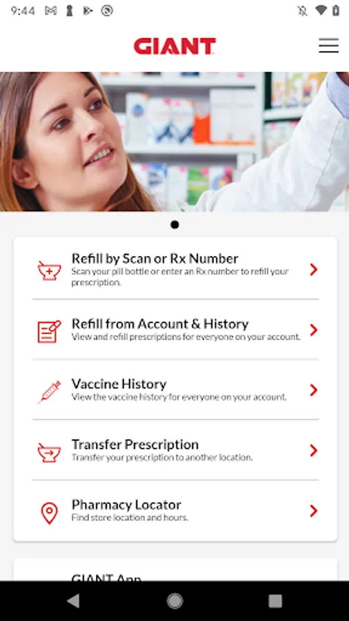 The GIANT Rx App lets you find pharmacies, manage your family's medications, refill prescriptions, and transfer prescriptions from one pharmacy to another using your mobile device.