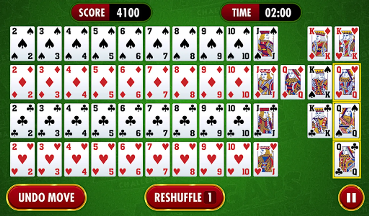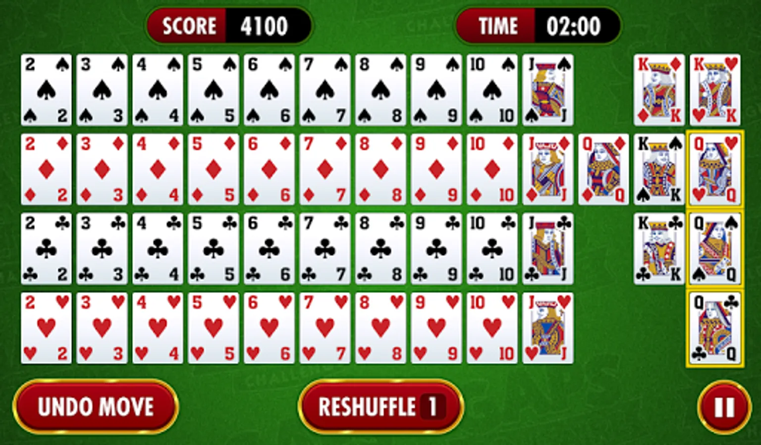 Gaps Solitaire (also known as Montana or Addiction Solitaire) is a challenging solitaire card game where you have to rearrange the cards into four rows so that the cards in each row are of the same suit and in ascending order from two to king.