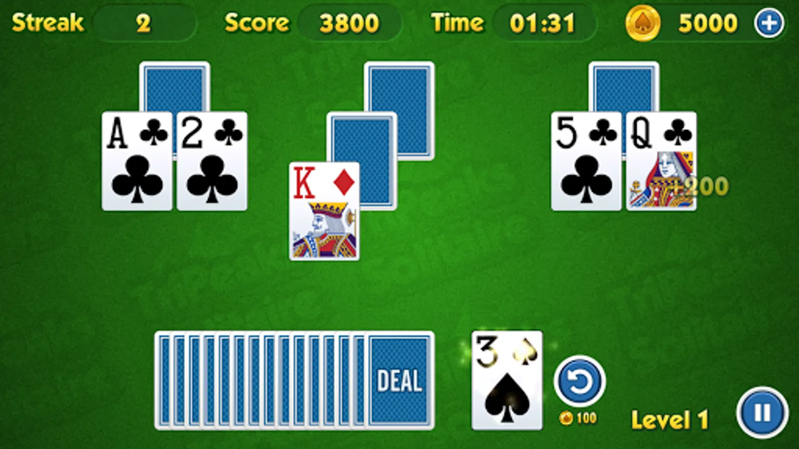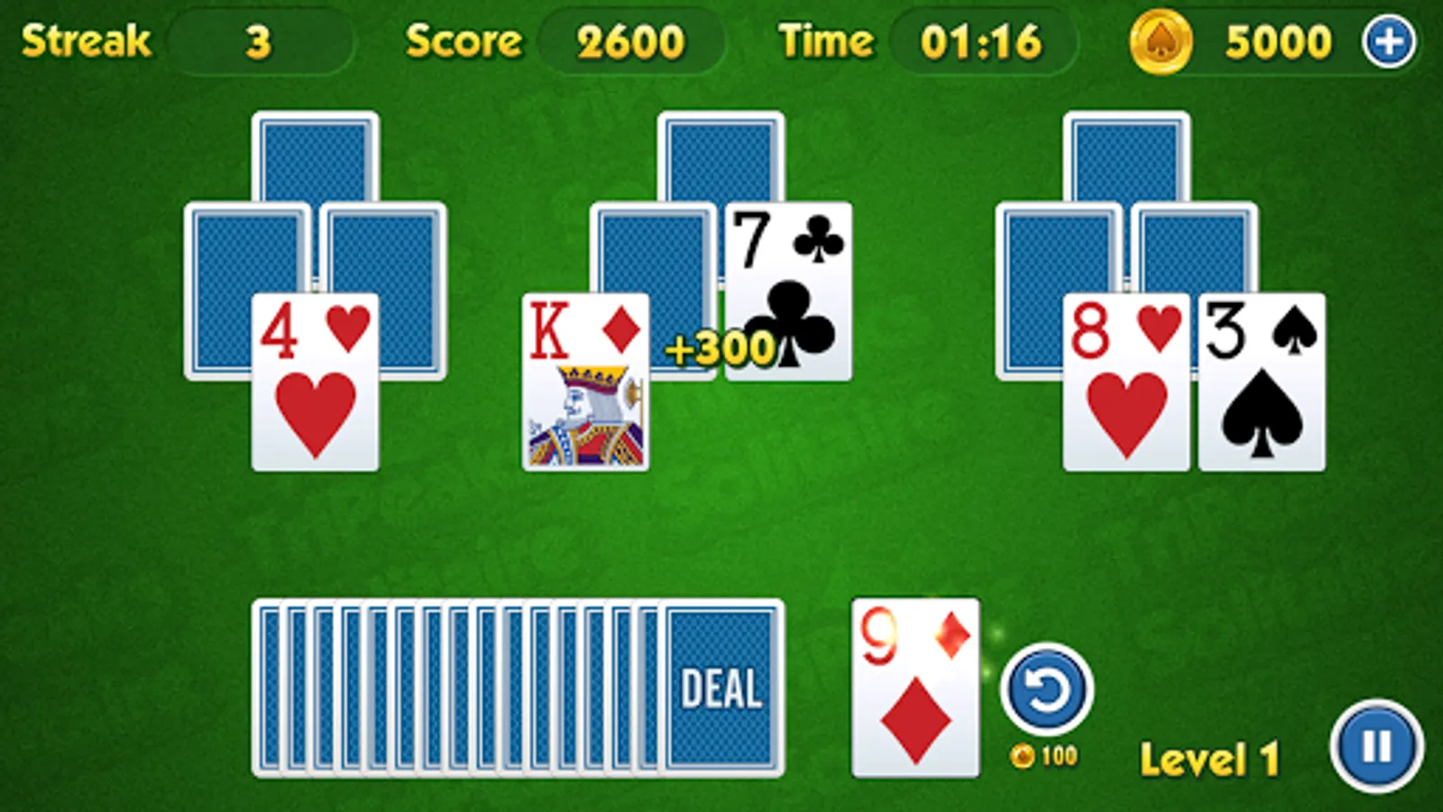 The object of TriPeaks Solitaire Challenge is to clear all of the cards from the three peaks. Just tap on the cards that are one rank higher or lower than the foundation card. If you run out of moves, turn over a new card from the deck. You earn points for each card you place on the foundation card and extra points for clearing each of the peaks.