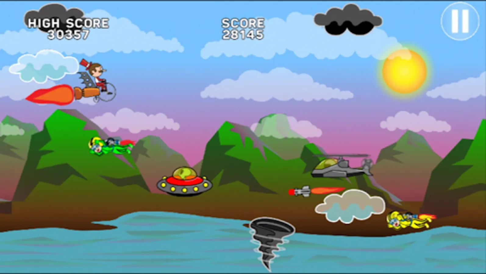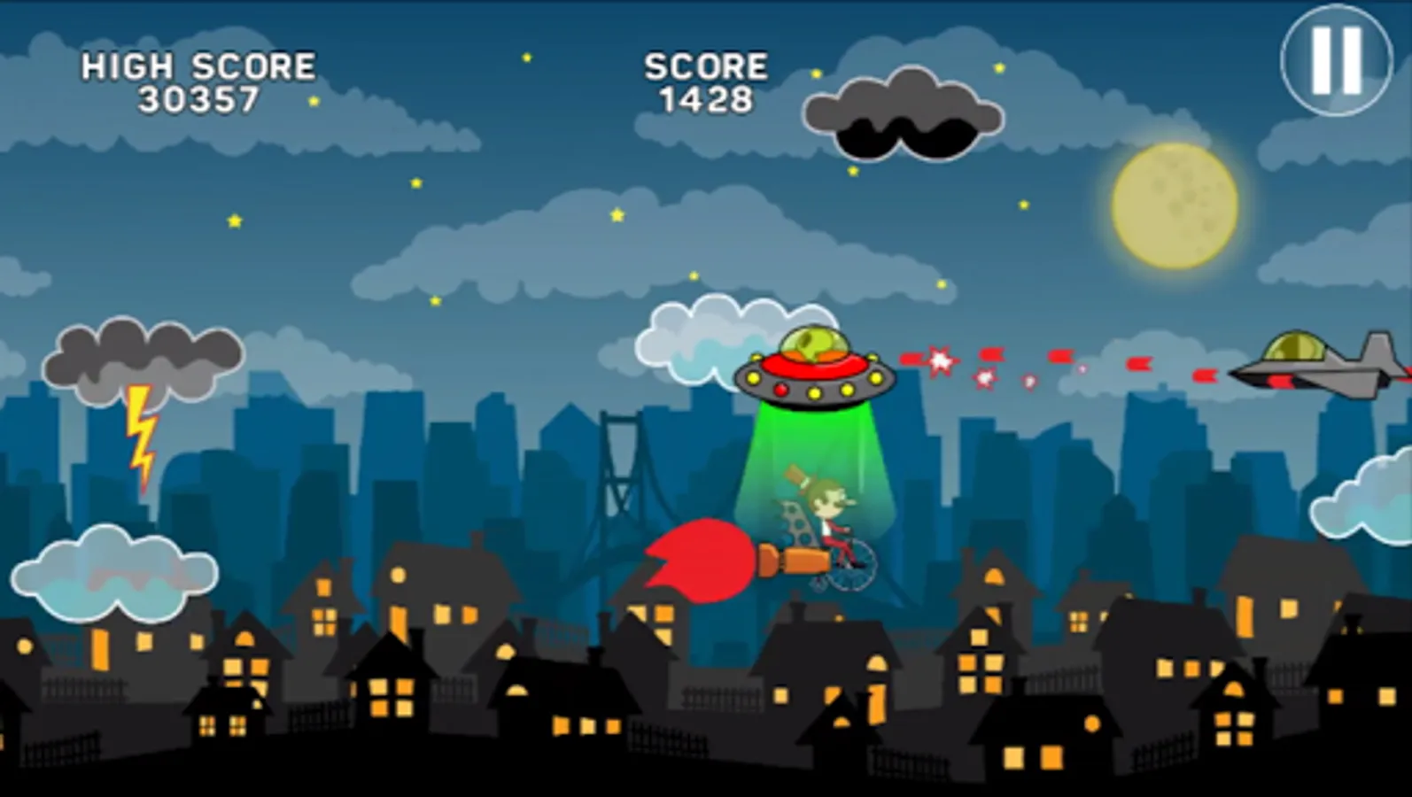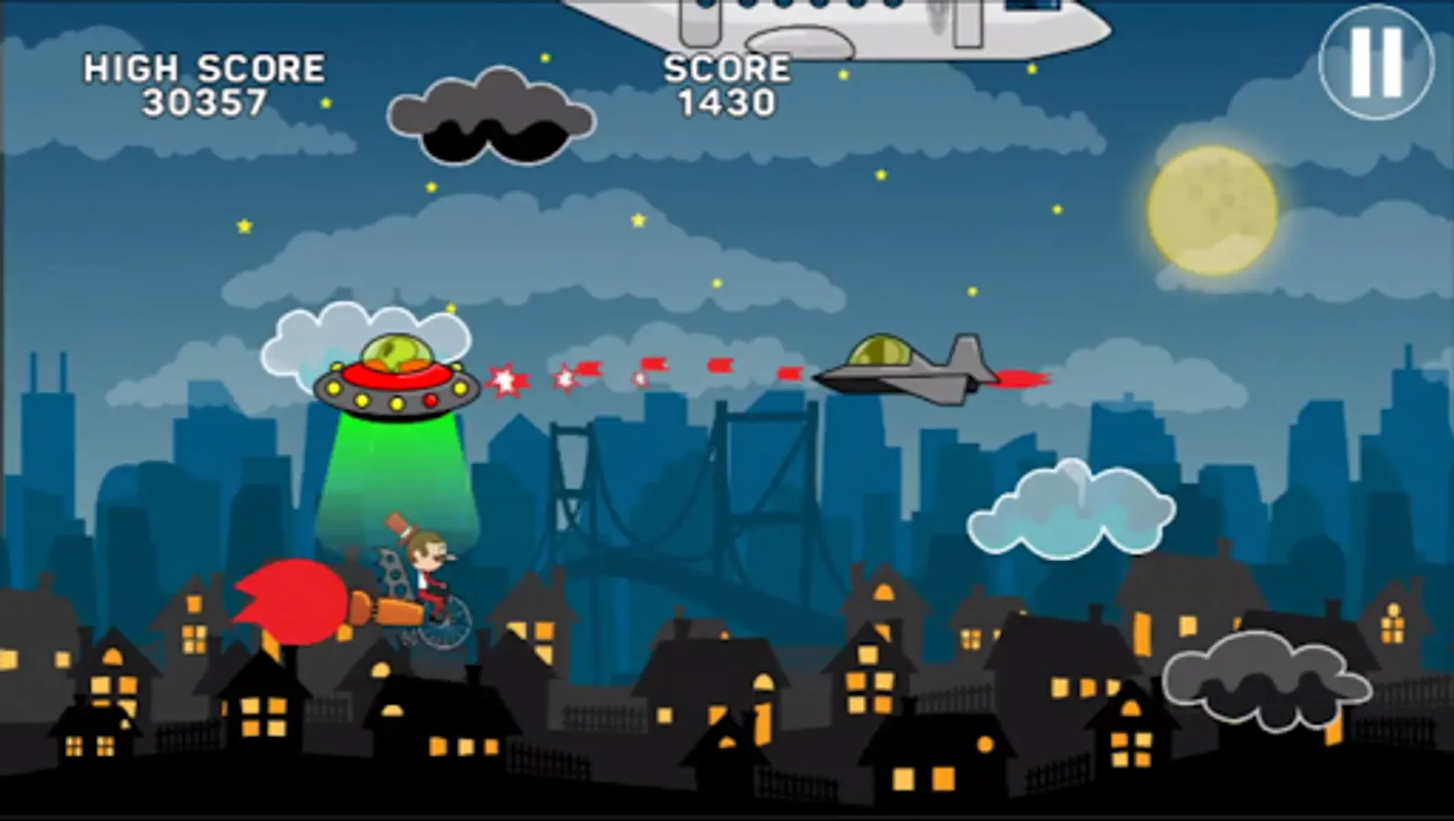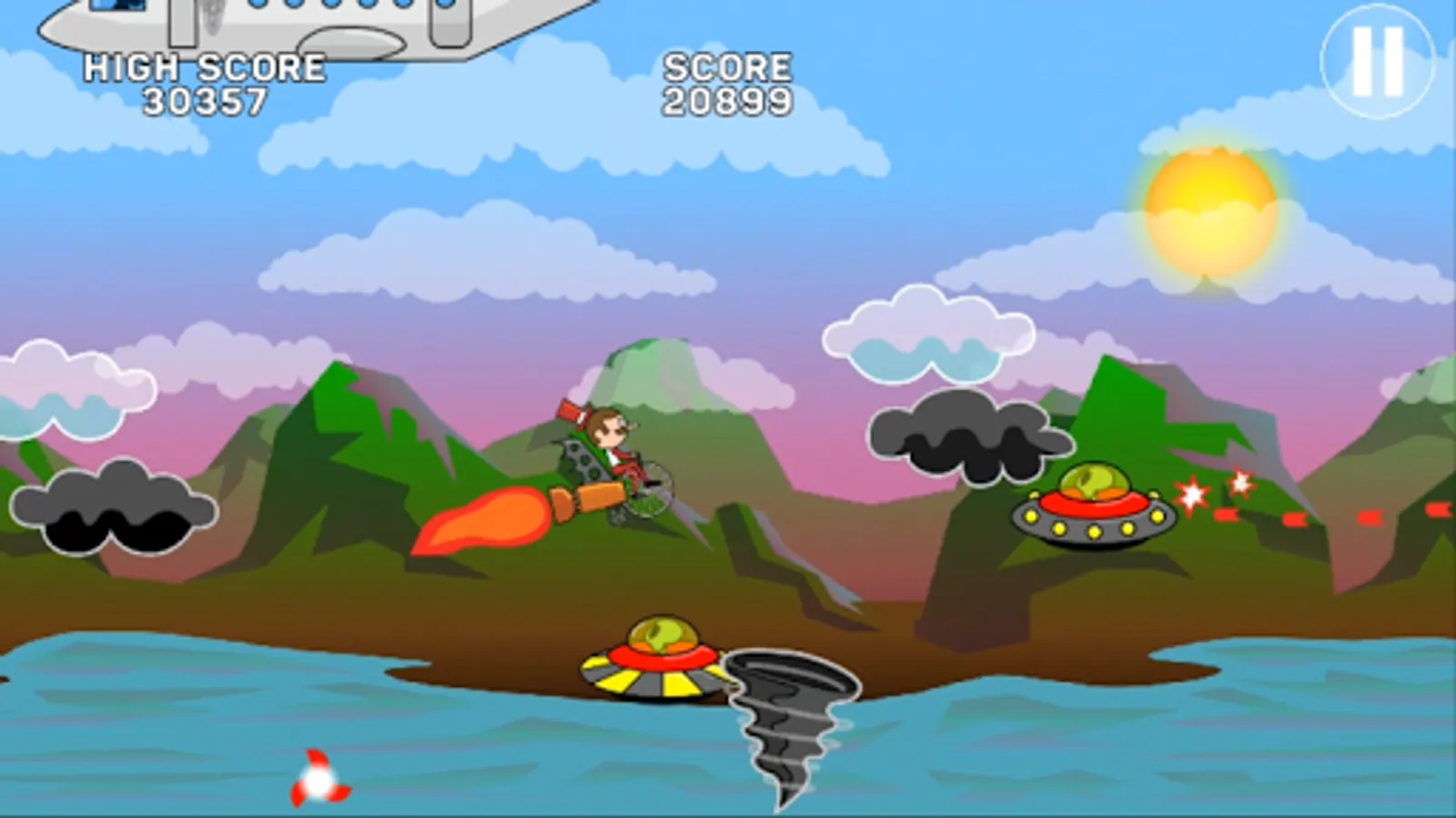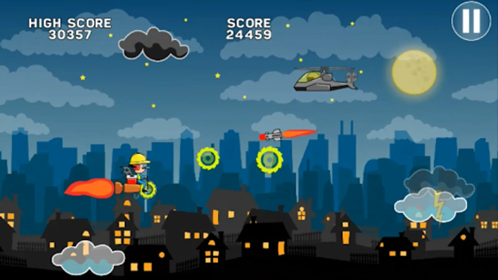 Our hero is a wacky inventor who fused together a Victorian era bicycle with a rocket engine.