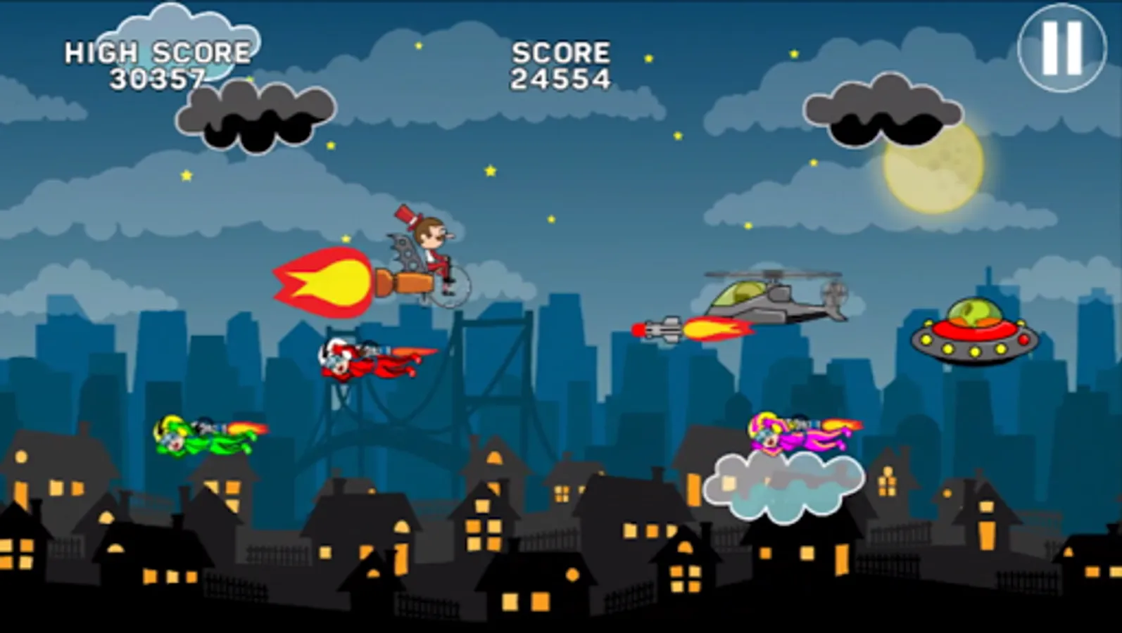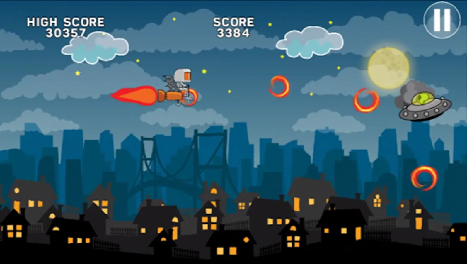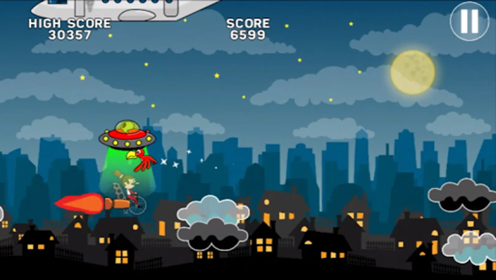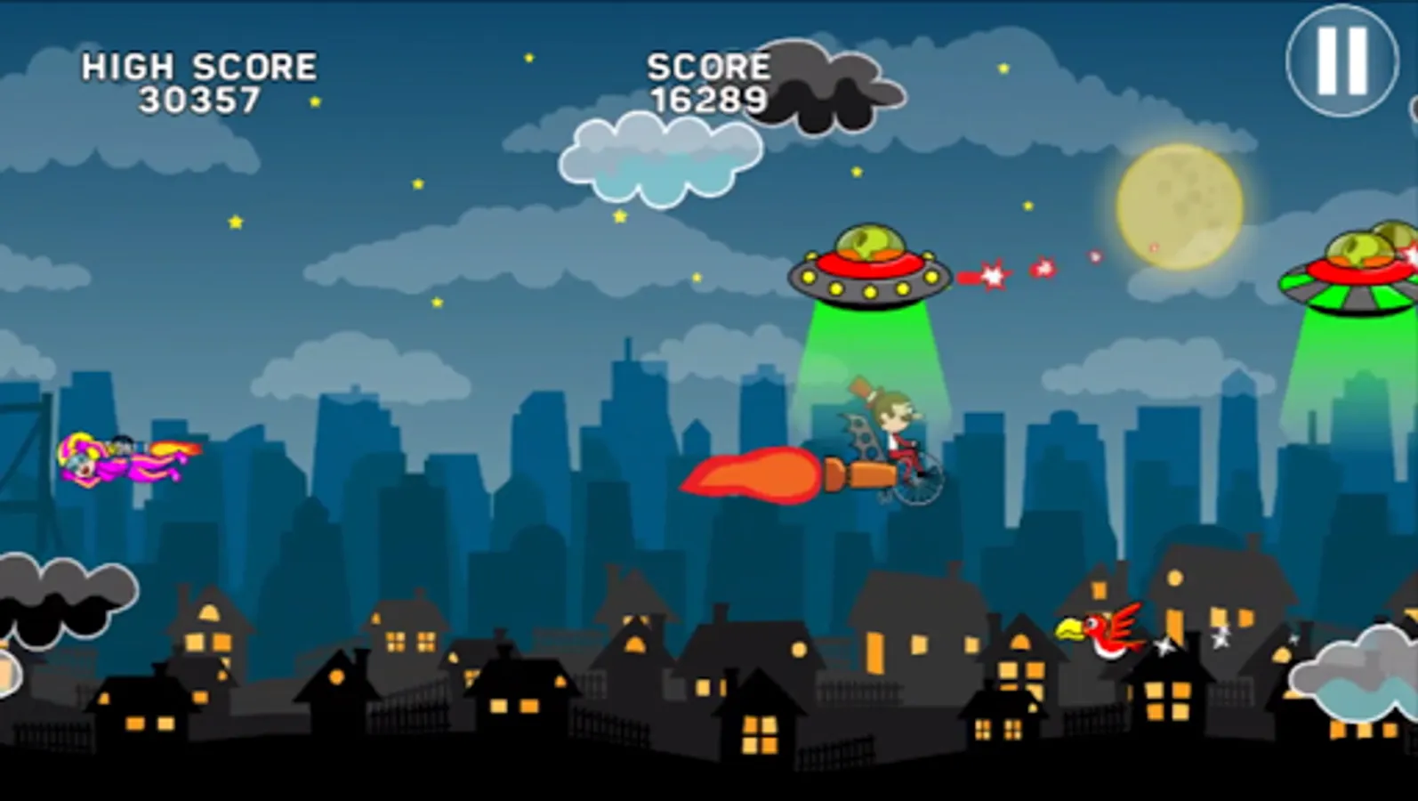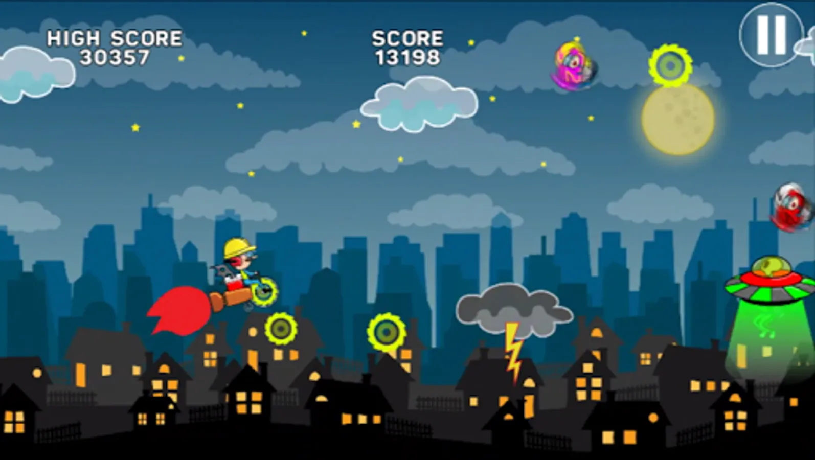 Our hero is a wacky inventor who fused together a Victorian era bicycle with a rocket engine.