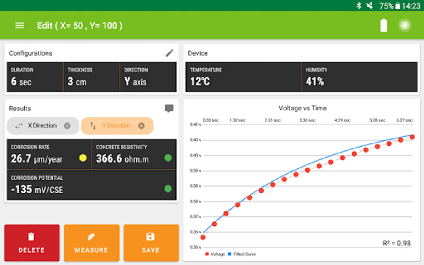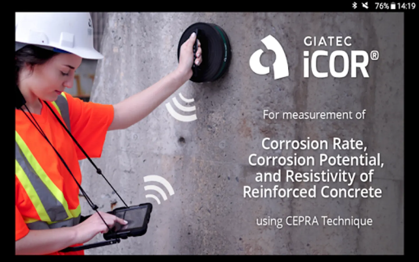 This application can be used to communicate with the Giatec iCOR™ device to measure the corrosion rate, concrete electrical resistivity and half-cell corrosion potential of reinforcement in concrete. Using the Bluetooth technology, the measured data along with ambient temperature and relative humidity are sent to the mobile application for data recording, analysis and post-processing. The results can be exported and shared in Excel and Text format for subsequent analysis.