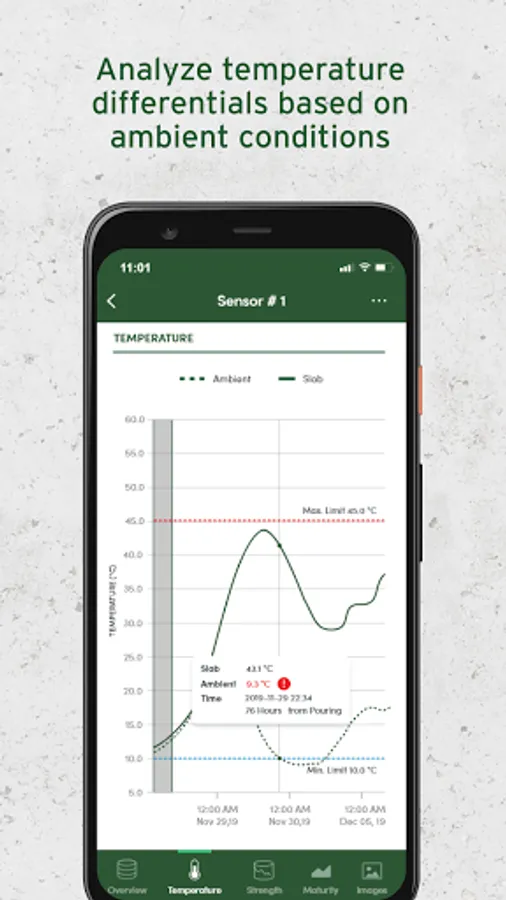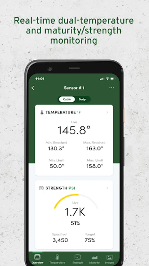 SmartRock has been equipped with dual-temperature monitoring capabilities. This enables users to measure temperature values at two locations simultaneously allowing users to easily monitor temperature differentials between the concrete’s core and surface.