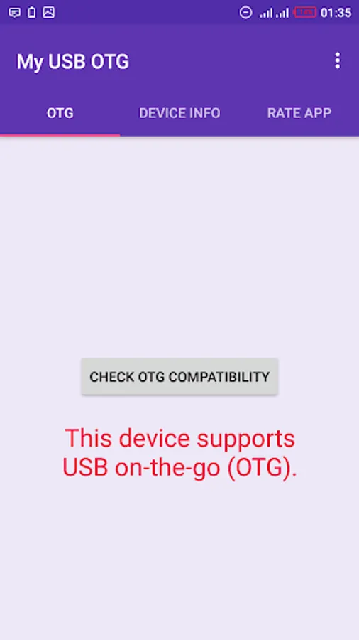 This app checks for your device's USB on-the-go OTG compatibility. USB OTG is a specification that allows you device to connect to other USB devices such as flash drives and hard drives. This app is an essential tool for checking if your device has such feature and specification.