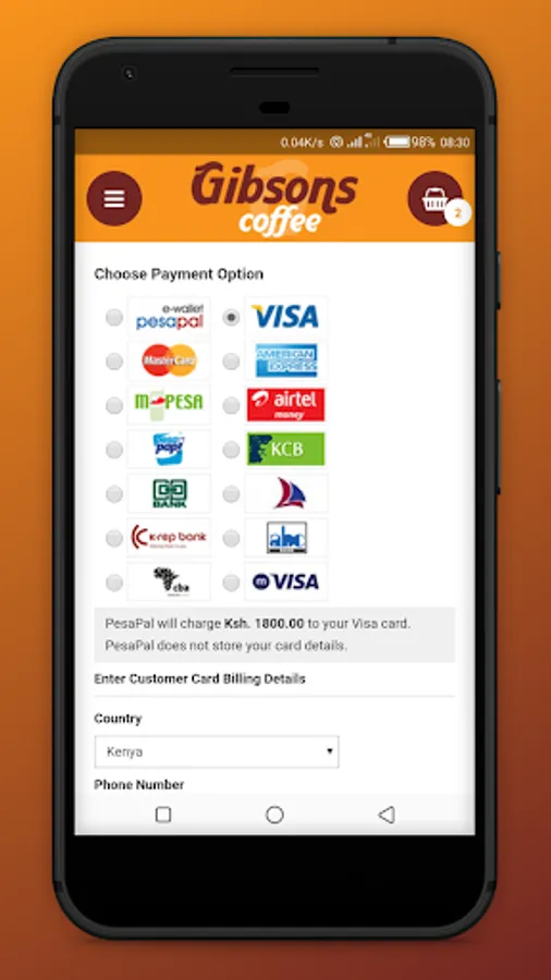 We accept visa, mastercard, MPesa and a multiple mobile bank payment options (pesapal) right in our app.
