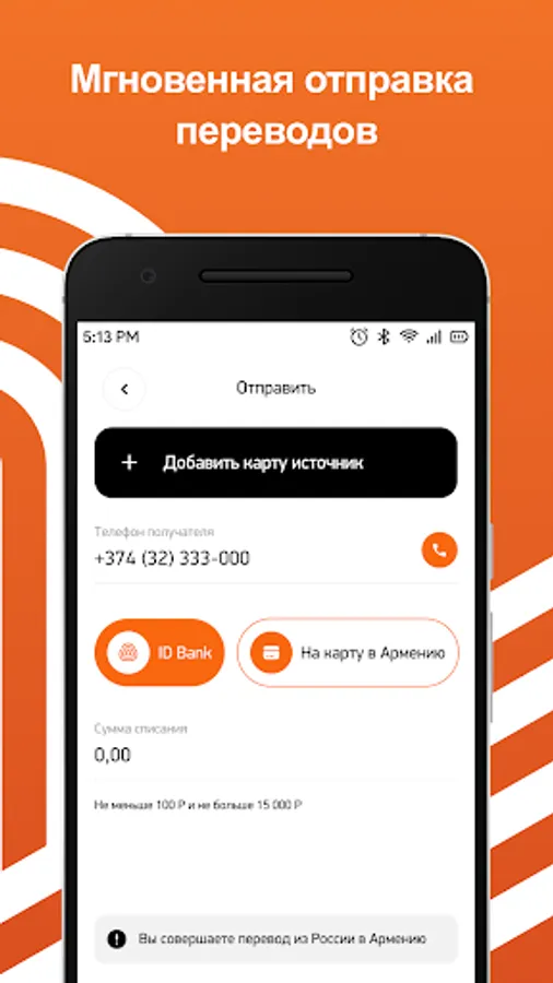 The IDpay application allows you to make convenient and fast money transfers from any Russian card to a card of any bank in Armenia.