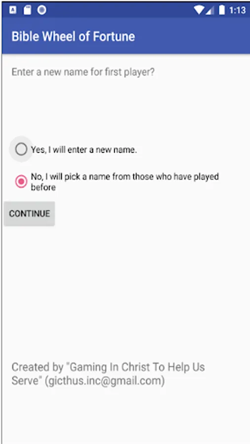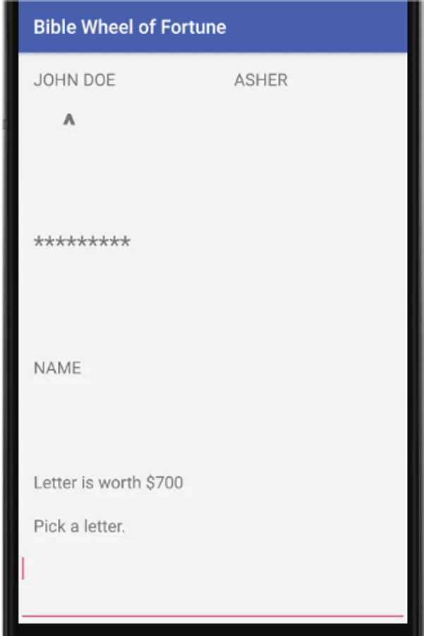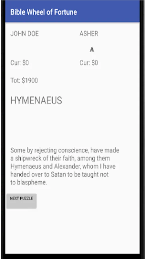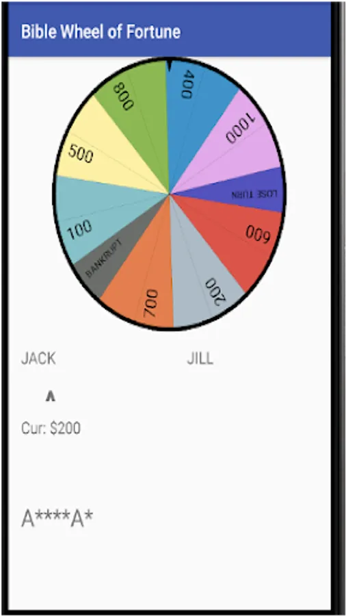 This is a two-player game based on the Wheel of Fortune quiz show. When the game is first played, the player’s names must be entered. After the first time, previously used names may be selected from a dropdown menu. Each game consists of four puzzles - names, places, and phrases randomly chosen from the Bible. A player clicks on the SPIN button to see a spinning wheel which determines the value of the letter that is guessed. If the wheel lands on the LOSE TURN spot then the play passes to the other player. If the wheel lands on BANKRUPT then he loses his turn and his current score is set to 0. If the user does not want to see the spinning wheel then he can click on the “SPIN - HIDE WHEEL” button. Any letter including vowels may be guessed. If the letter is not in the puzzle then the player loses his turn. He also loses his turn if he guesses a letter that has already been guessed. After the first letter is guessed a player may click the SOLVE button instead of a SPIN button. The solution entered is not case sensitive. When the puzzle is solved the game shows some information about the puzzle name, place or phrase.