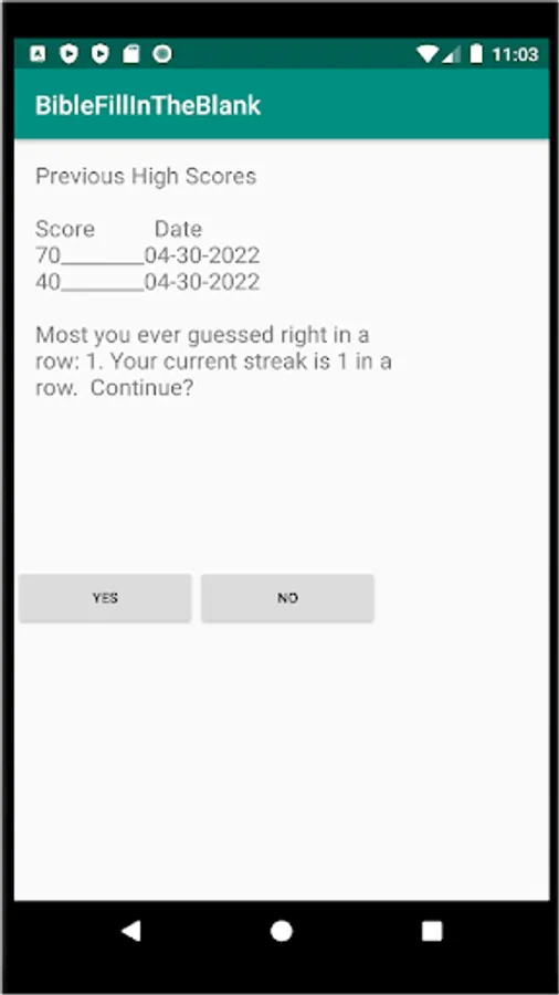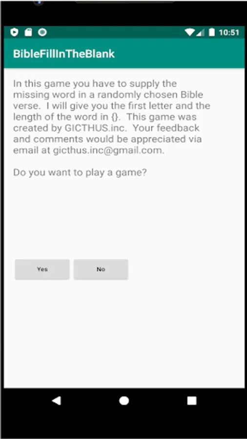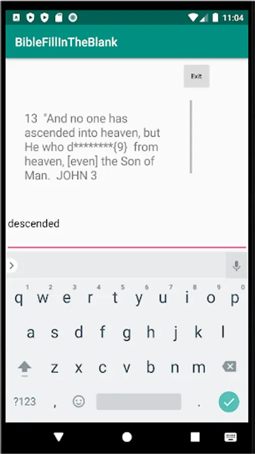 This app randomly chooses a verse from all the verses in the New Testament. The first longest word in the verse is replaced with stars. You are given the first letter of the word and also you are given how many letters are in the missing word. You have to guess the word. There are 10 verses in each game. Your 5 best scores are saved along with your current and all-time record for most words you got right in a row. The words can be entered using a keyboard with voice input.