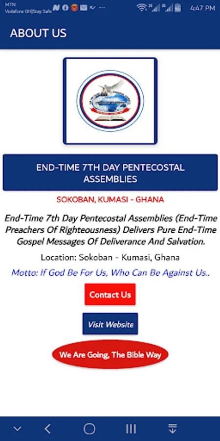 Once the application is downloaded and installed, you can get our social media channels (facebook and youtube) where you can watch livestreaming and pre-recorded end-time gospel videos, read posts on our social media platforms. The app also contains website, contact information as well as info about us.