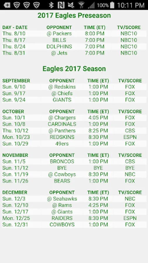 Go Eagles! stores and displays the schedule and scores for the Philadelphia Eagles football team. If internet access is available, the schedule is updated with the latest team scores. Most importantly, the schedule is displayed even when internet access is not available.