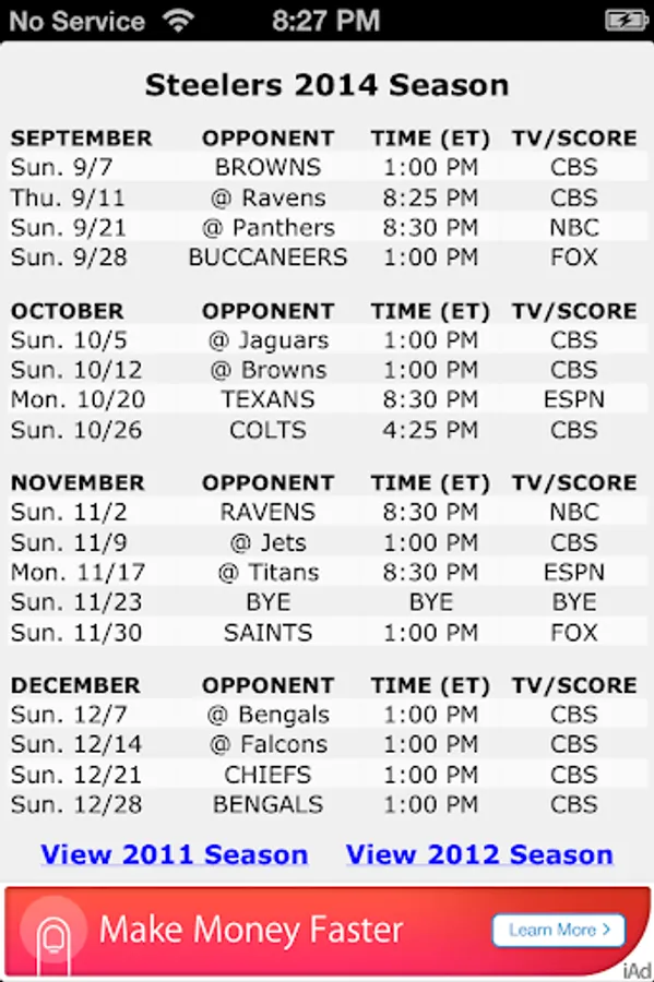 Go Steelers! stores and displays the schedule and scores for the Pittsburgh Steelers football team. If internet access is available, the schedule is updated with the latest team scores. Most importantly, the schedule is displayed even when internet access is not available.