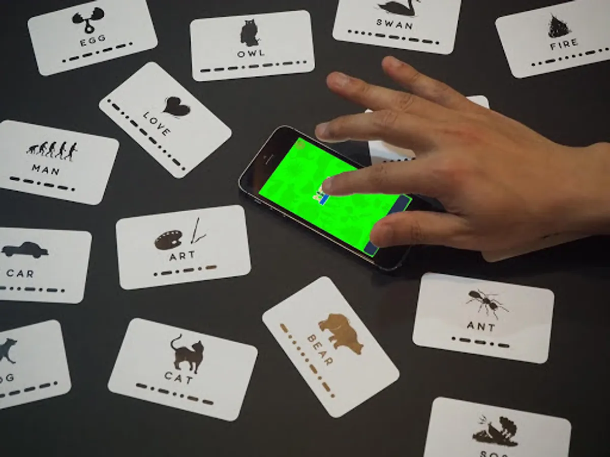 The game is played with one player using a smartphone app to send out Morse code messages. The other players listen to the message, and grab the card which corresponds to that message as fast as they can.