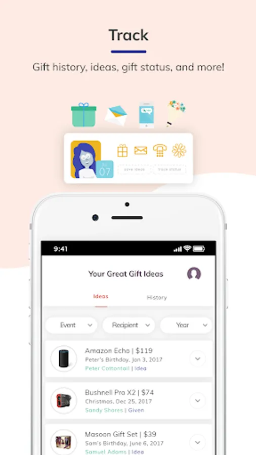Gift Guru is an app to simplify all aspects of gift giving! Track birthdays and recipients, get event reminders, save gift ideas and history, budget, and more!