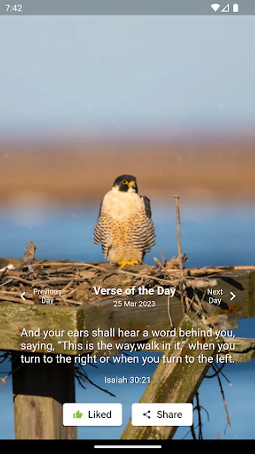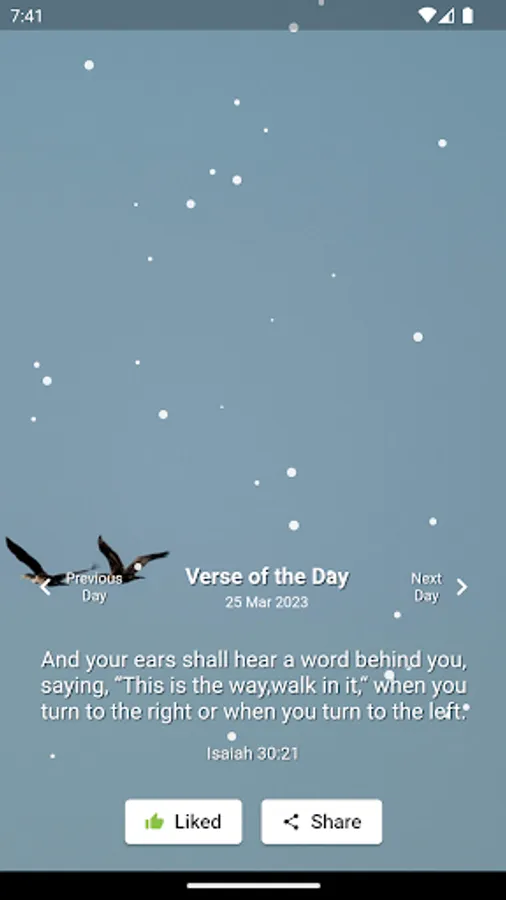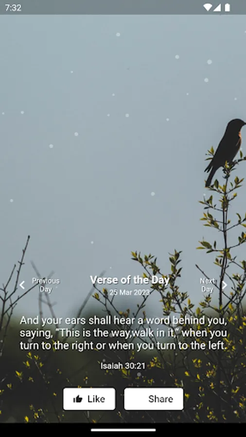 Our app is easy to use and provides a variety of features to enhance your experience. You can like your favorite verses, share them with friends and family, or even revisit verses from previous days. Whether you're looking for a quick pick-me-up or a deeper connection with God, our Daily Bible Verses app has you covered.
