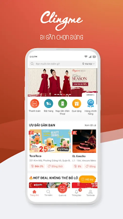 With nearly 5,000 great deals per day at more than 300,000 shopping locations nationwide, just use the Search feature on Clingme and you'll find the closest and best places around you, from restaurants to shops. street food, fashion, spa to pharmacy, gas station, ATM ...