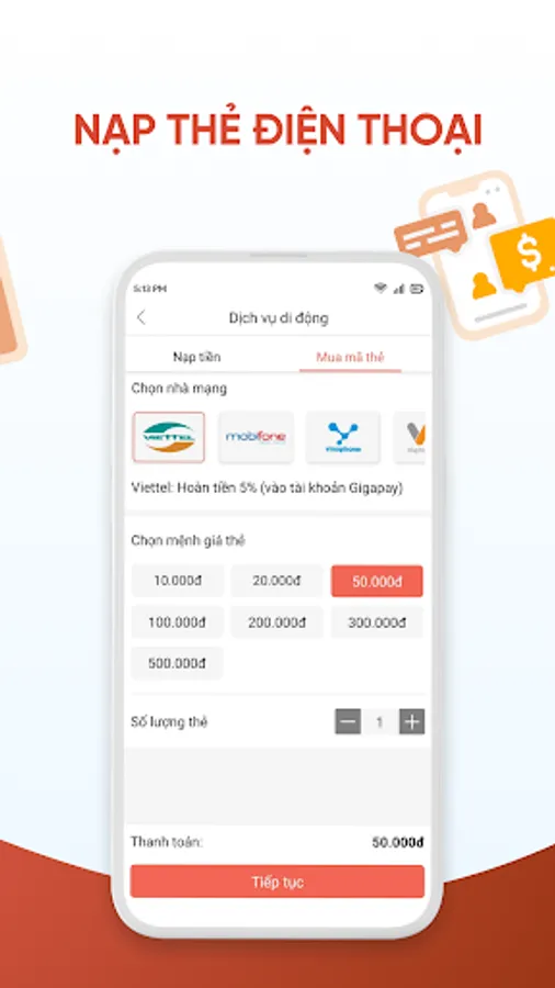 Recharge / buy phone card codes of Viettel, Mobifone, Vinaphone, Vietnamobile networks quickly and conveniently with up to 5% cashback.