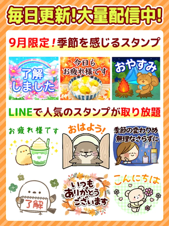 "Friends Hakuma" "Healing Dog" "Mofu Piyo" "Assault! Sea otter, Urusetori, Hanako, Yuru Usagi, Beni Orange, Girly bear, Canned cat, One day of cute housewife, Panda cat, Keigo bear ] "Yururin Panda" "Purukuma-san" "Girly bear-san" "Hitoe Usagi" and many other popular stamps!