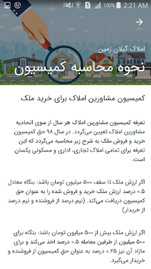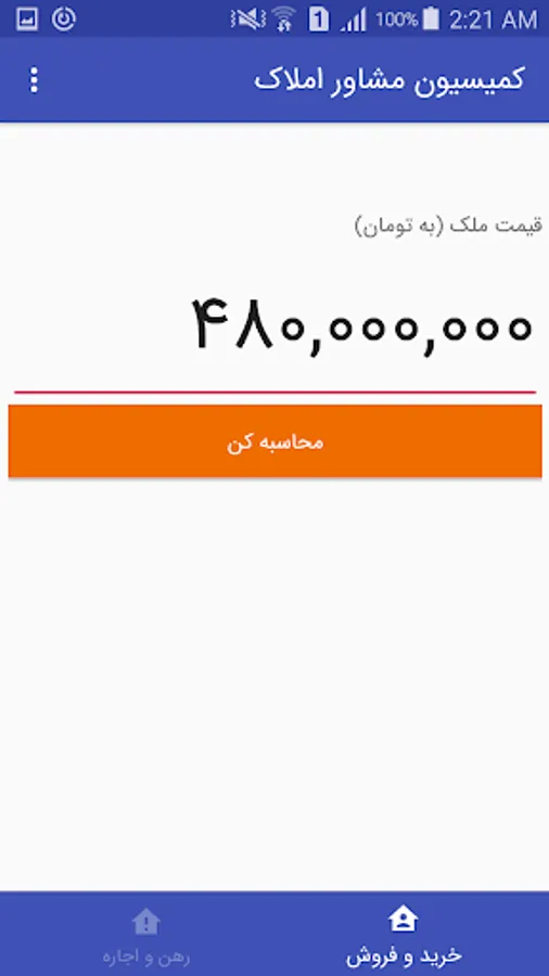 With this application, you can calculate with one click, the fee or commission of the real estate company for buying and selling property, as well as mortgaging and renting the property. The commission received by real estate consultants is based on a special formula that is announced every year by the union of real estate consultants, and receiving more than that amount is against the law and can be followed.