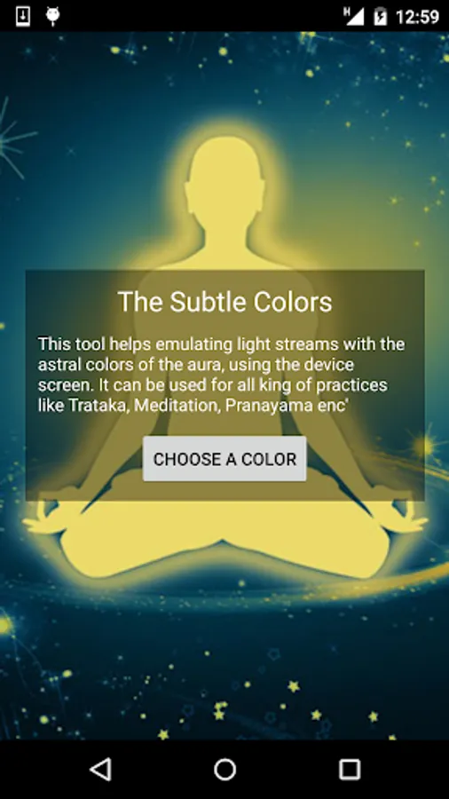 This tool helps to emulate light streams with the astral colors of the aura, using the device screen. It can be used for all kind of practices like Trataka, Meditation, Pranayama enc'