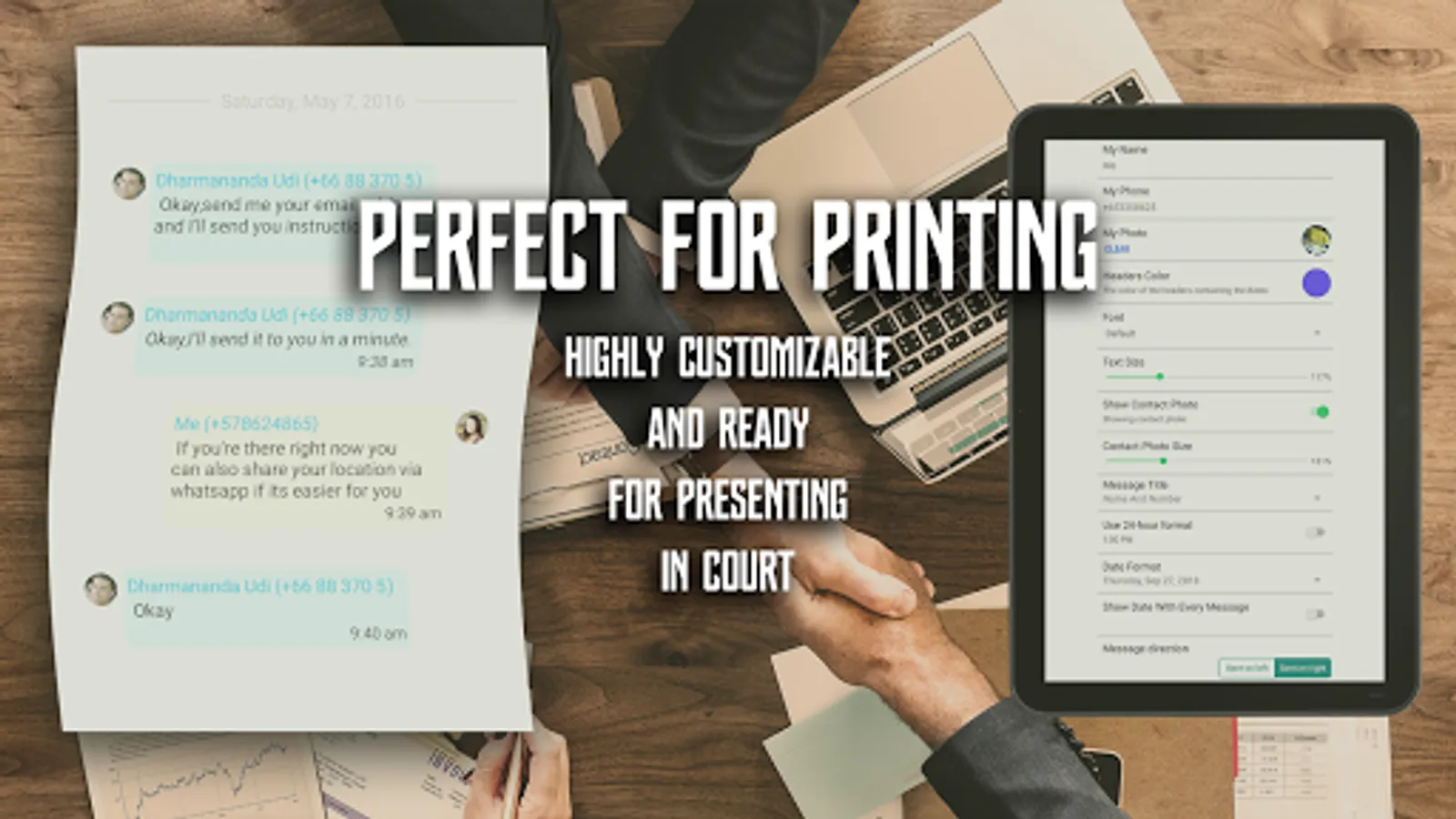 Export your WhatsApp chats conversations into customization human-readable formats. Perfect for backing-up important conversation and for printing for court purposes.