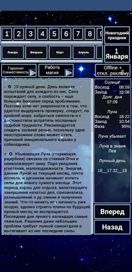 The program contains the phases of the moon, the calendar of lunar days and the position of the moon in the signs of the zodiac for each day.