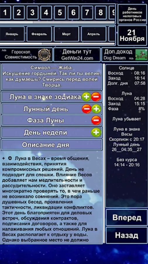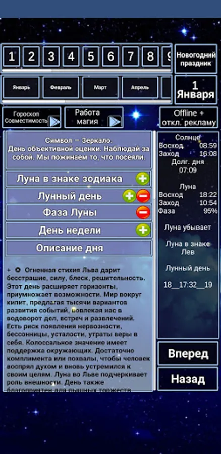 For each day, there is a detailed description of the lunar aspects, their interpretation and recommendations, as well as an astrological forecast.