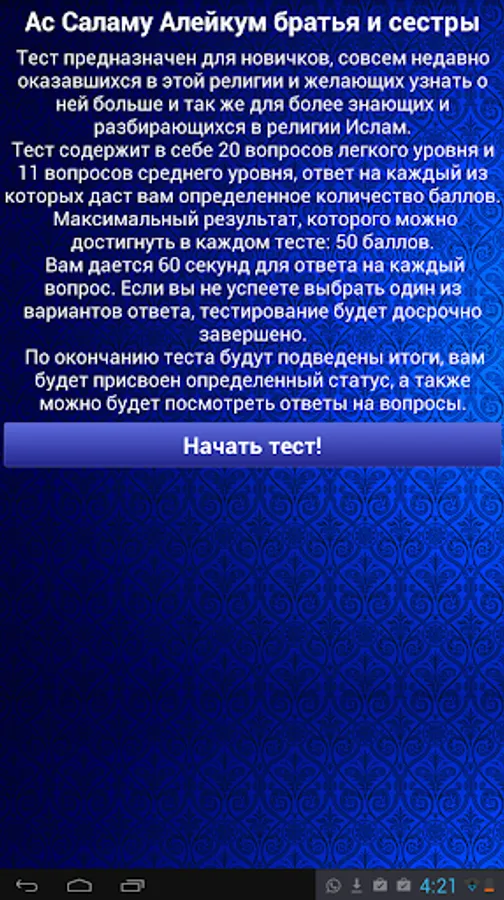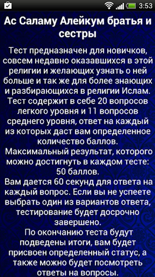 Description: The test contains 75 questions in total and three categories: 1 - Quran 2 - Seerah (Biography), and