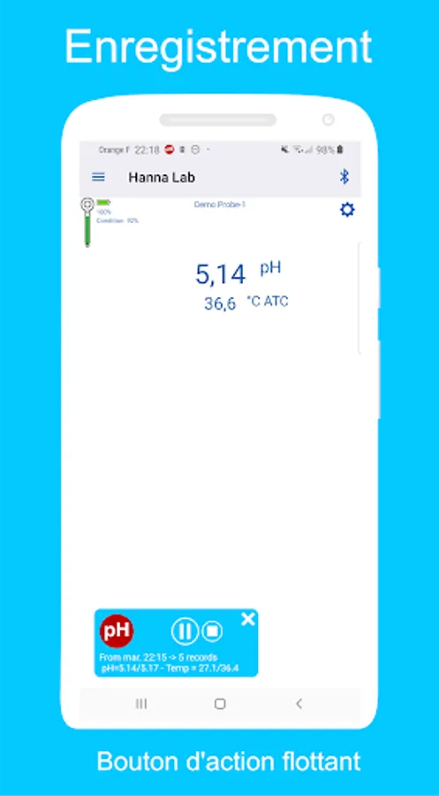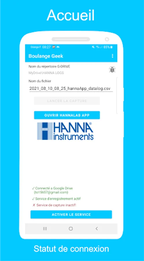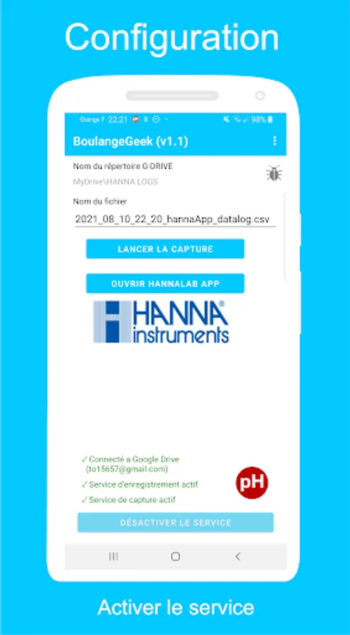 .Capture in real time in a file of the cloud "Google Drive" the data of pH and Temperature of the Hanna Lab application.