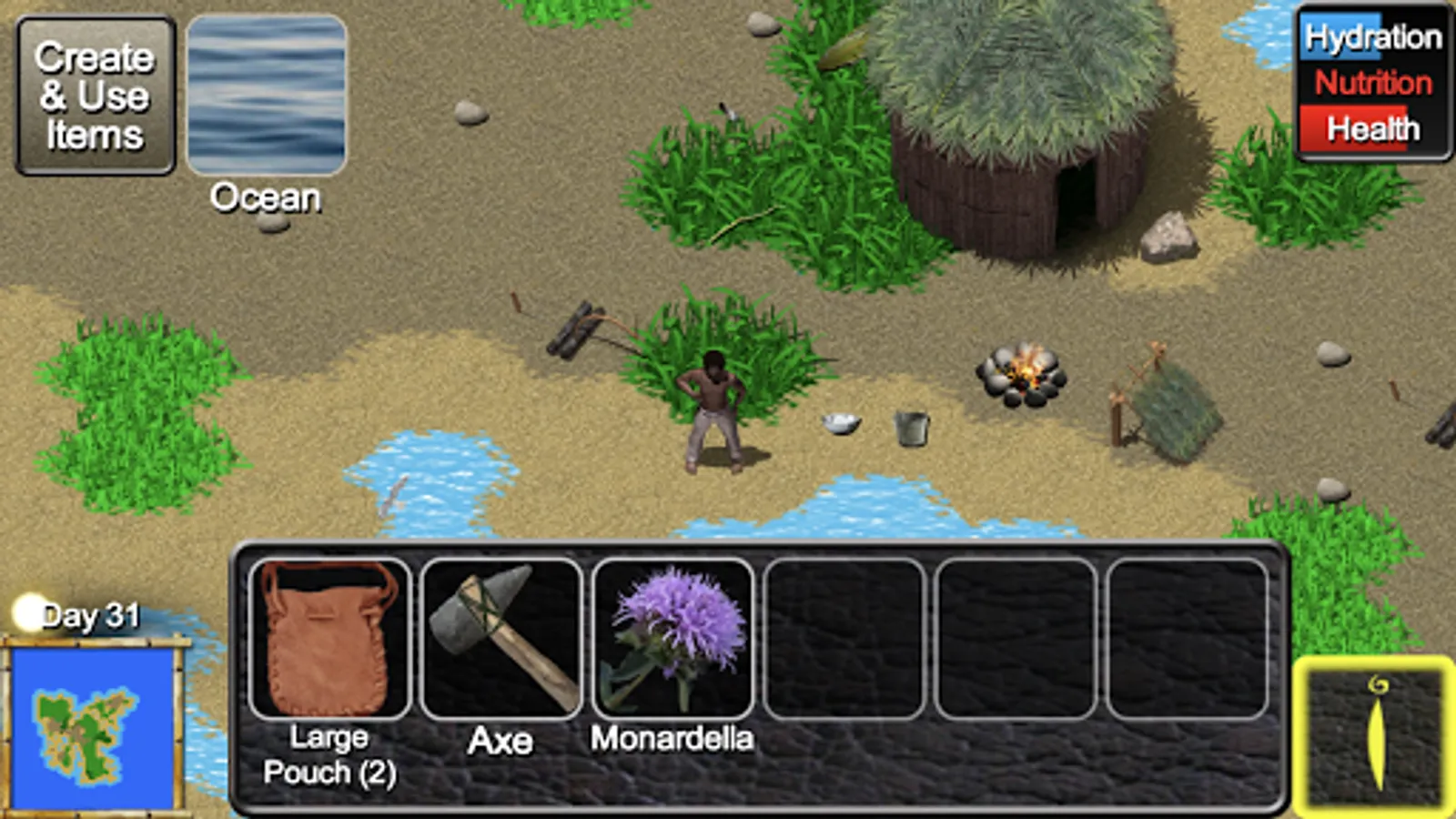 You must use your survival skills to stay healthy and get rescued. Build shelter, find food and drink, and collect salvageable parts from the wreckage that wash ashore. Use the parts to build a space phone and call for a rescue team to win the game.
