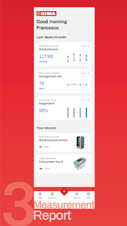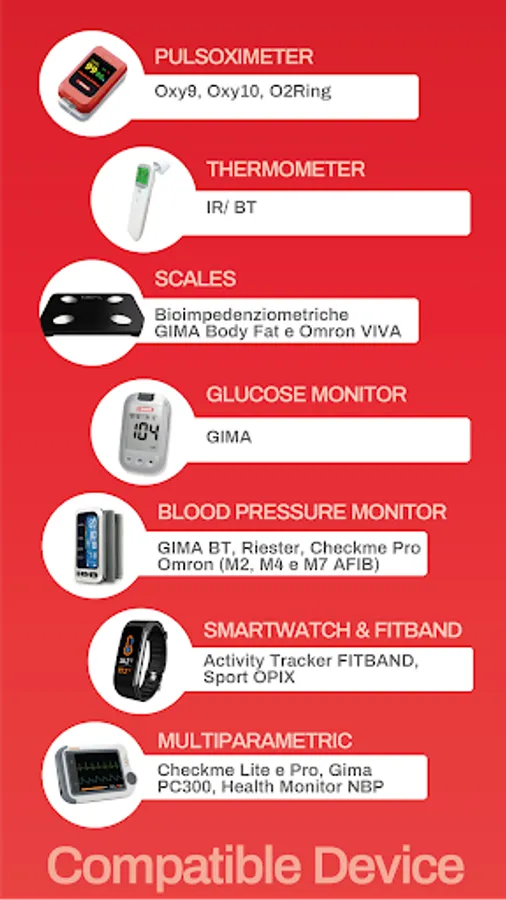 With GIMApp you can measure temperature, blood pressure, heart rate, weight and body composition, blood saturation, ECG, sleep, blood glucose, physical activity and much more. GIMApp is available in 10 languages (GB, FR, IT, ES, DE, NL, GR, PT, RO, PL).