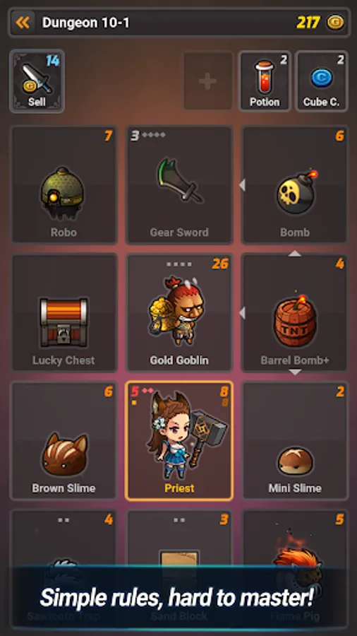 Attack monsters and blocks with weapons, character's Hp, and bombs, and collect points by collecting gold while recovering character's health with potions. You can acquire new dungeons and characters by increasing the number of points while earning skill cards with the power of the cube. You can also unlock characters' abilities and new skill cards with gold from dungeons.