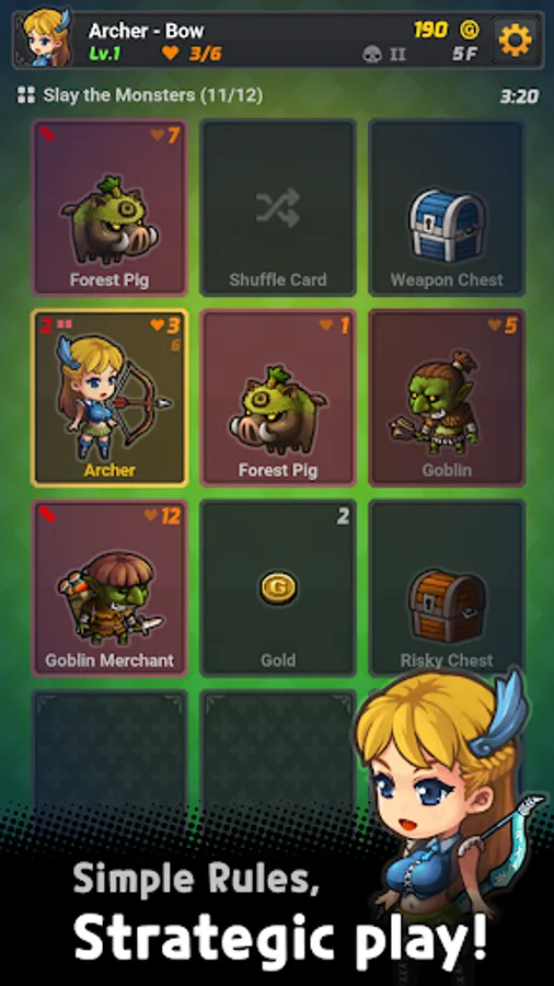 "Goblin Pass" is a card battle game in which players move characters strategically, attack enemies, and clear dungeons.