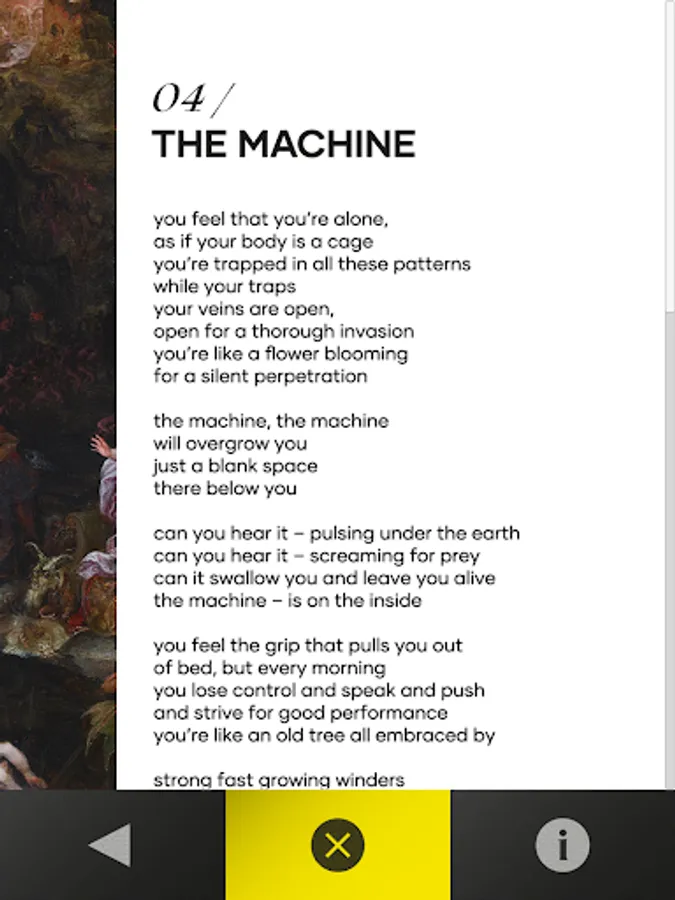 "How To Hear A Painting" is the fourth album of the Dresden quartet "Woods of Birnam" and celebrates the reopening of the Gemäldegalerie Alte Meister of the Staatliche Kunstsammlungen Dresden. The album contains twelve songs (plus ten interludes) and was inspired by the old masters. Those paintings that you can fully see and experience again in the freshly renovated Sempergalerie in Dresden from the end of February 2020. This app offers the opportunity to digitally relive the paintings in conjunction with the associated lyrics and audio streams.