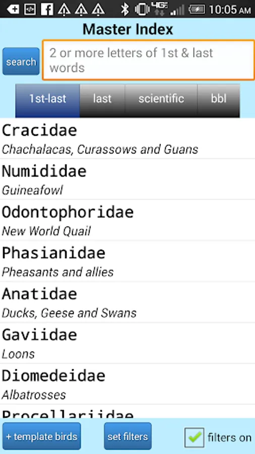 Search DB in alphabetic or taxonomic order. Or find birds by last word of name, 1st&last word, scientific name or BBL code.
