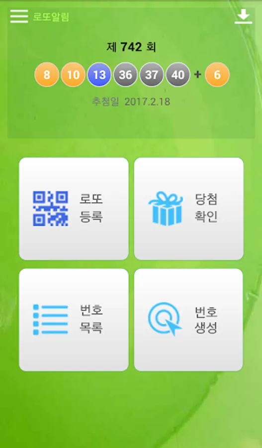 - 로또알림은 1~45번 번호 구간에서 6개 번호를 임의 추출해 주는 번호생성기 앱입니다. 생성된 번호는 실제 결과와는 연관성이 없음을 알려드립니다.
