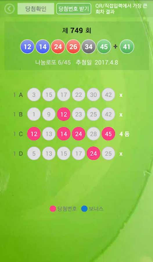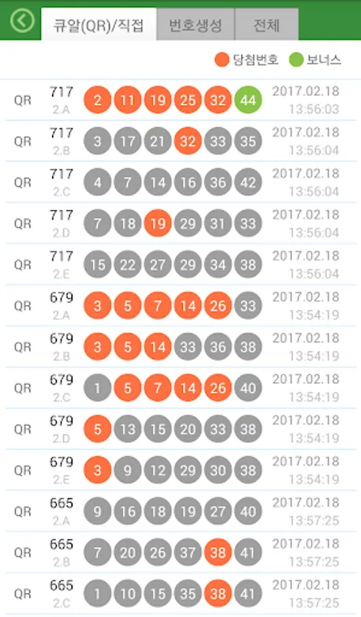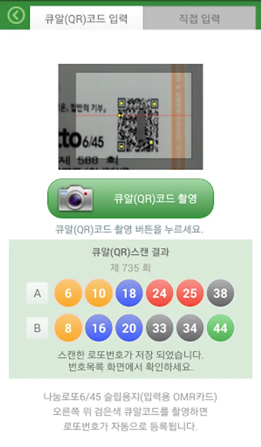 로또 슬립용지에 인쇄된 큐알(QR)코드를 촬영하여 로또번호를 자동등록 관리하세요. 과거 구입한 번호들과 회차별 당첨번호의 비교도 가능합니다.