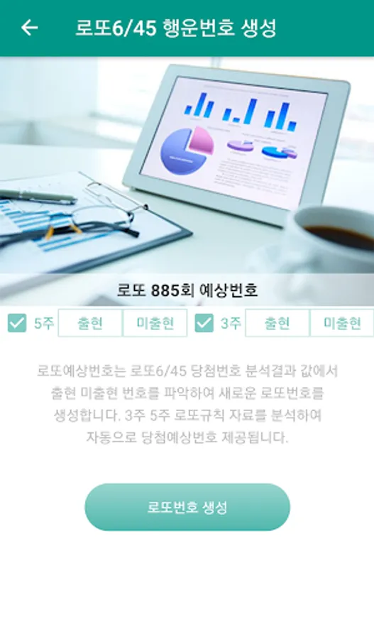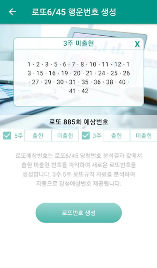 It is an app that extracts expected lottery numbers by applying a combination of 5 lotto numbers that have recently appeared and not appeared.