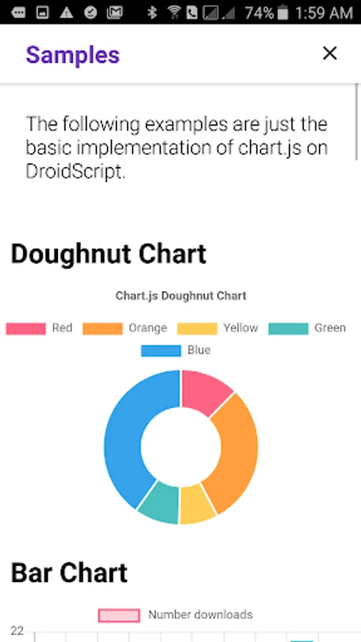 ChartJS for DroidScript is a chart plugin built from chartjs library. You can use it to implement elegant and interactive charts on your DroidScipt app.