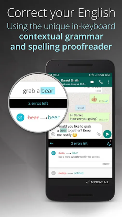 While other well-known keyboards such as Gboard and Swiftkey offer auto-correction on the current word only, Ginger Keyboard checks your whole sentences using a unique Contextual Grammar and Spell Check proofreader. Either you want to send a short fine chat message or long complex quality email, with Ginger Keyboard you are all covered!
