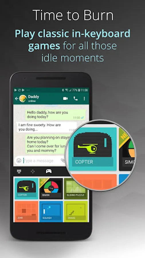 Customize your keyboard with your favorite and most frequently used apps. Take notes, create events, send emails and chat for a truly optimized and productive mobile flow. - ▪ Keyboard in-app games